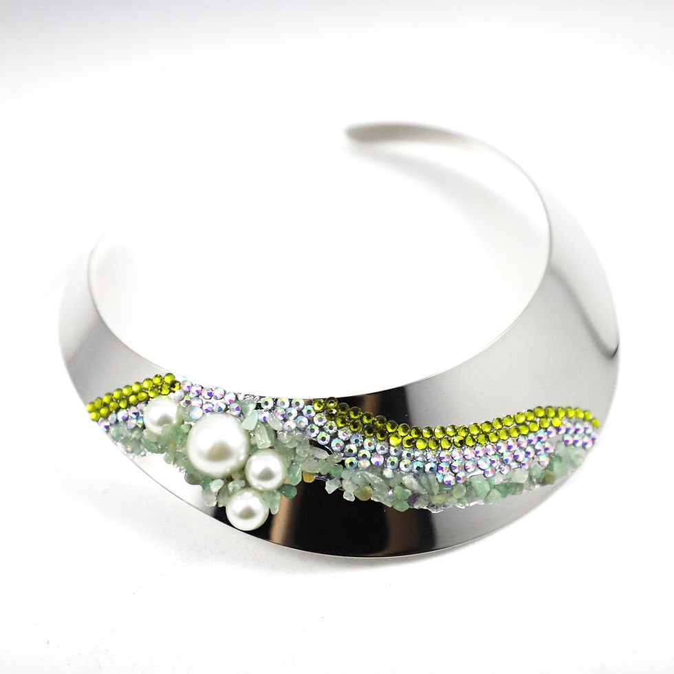 Gold Plated Necklace with blue and green Crystals, details of paint